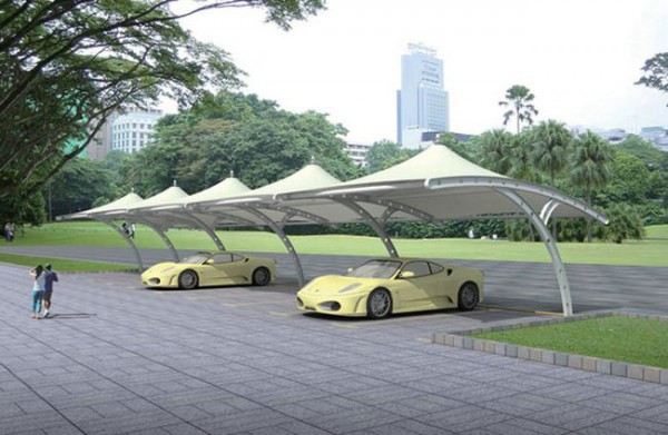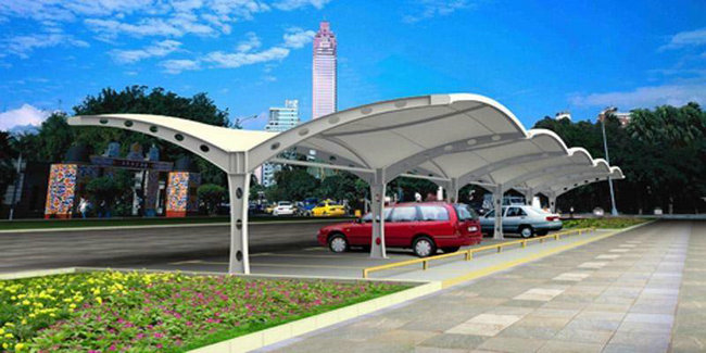 膜結(jié)構(gòu)停車棚以一種類似帳篷、充滿柔性的建筑越來越多地出現(xiàn)在城市廣場、公園邊上,以其優(yōu)美的曲線吸引了大眾的目光,其造型自由輕巧、阻燃、制作簡易、安裝便捷、節(jié)能、易于使用。作為一種特殊的現(xiàn)代建筑結(jié)構(gòu),以高強度柔韌性薄膜材料與張拉體系相結(jié)合,形成的具有一定剛度的空間結(jié)構(gòu)體。